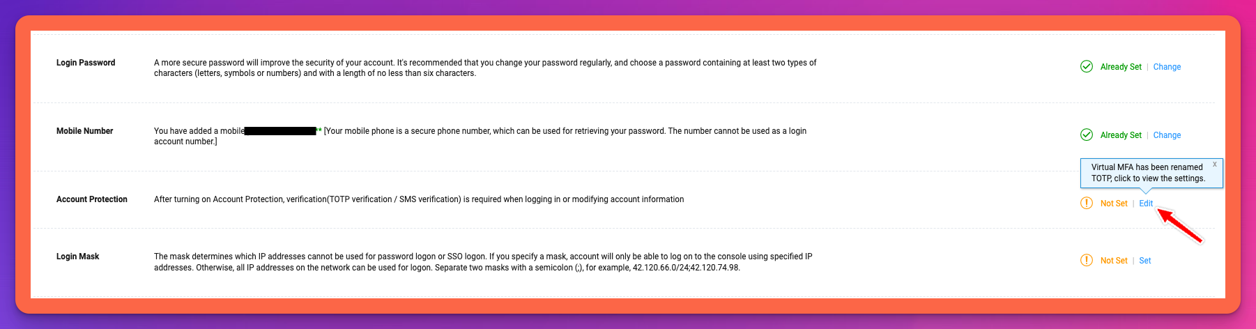 Multi-factor authentication (MFA) adds an extra layer of security to your Alibaba Cloud root account by requiring a second factor, such as a mobile phone, in addition to your password.