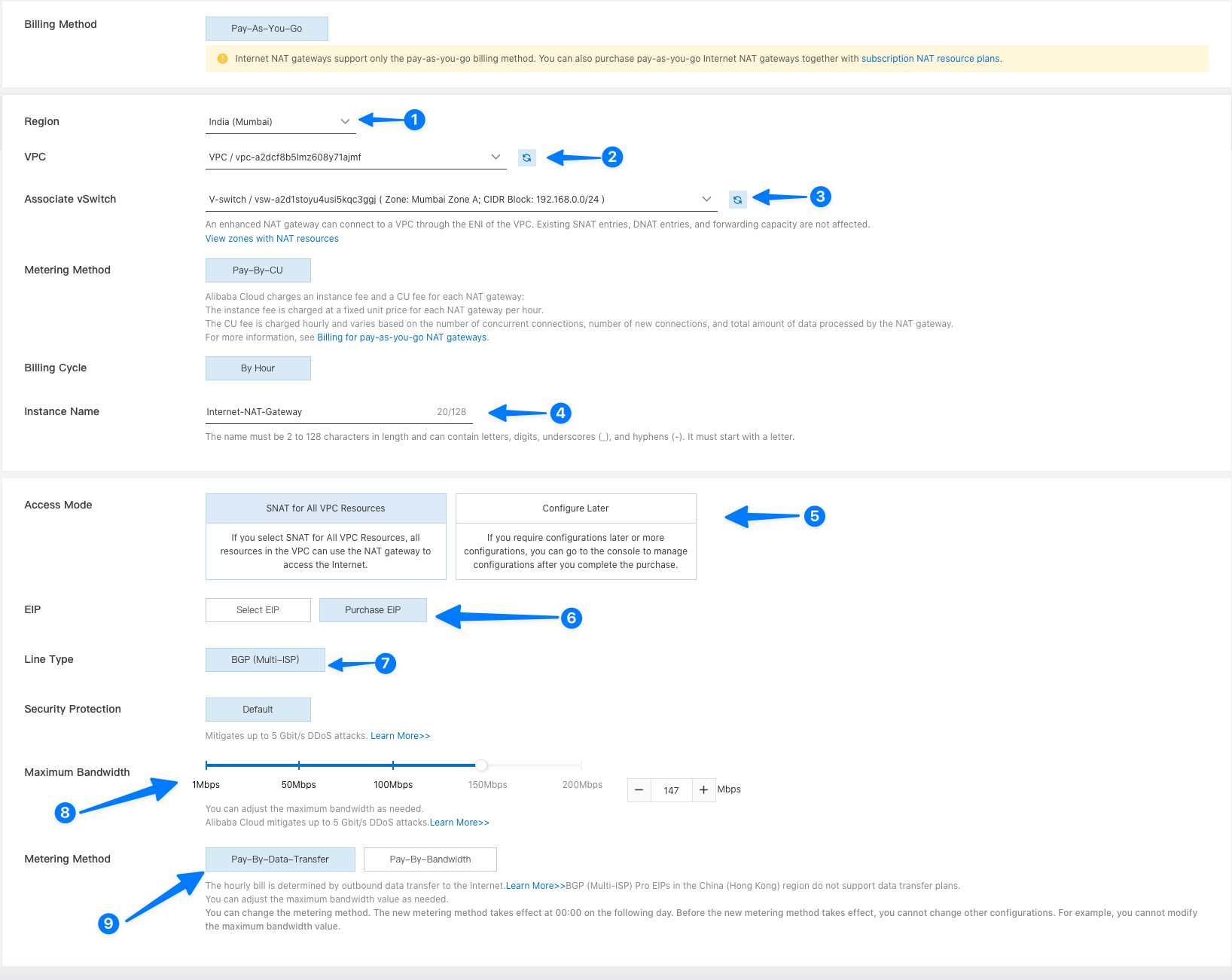 - Configure the NAT Gateway by specifying the VPC, region, and bandwidth requirements.