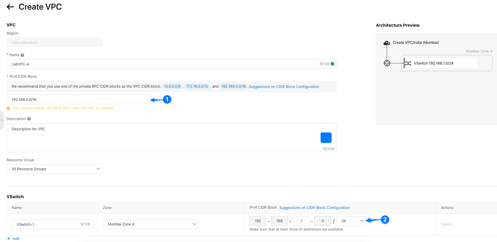 - VSwitch: Create a VSwitch within VPC A with a CIDR block (e.g., 192.168.1.0/24)