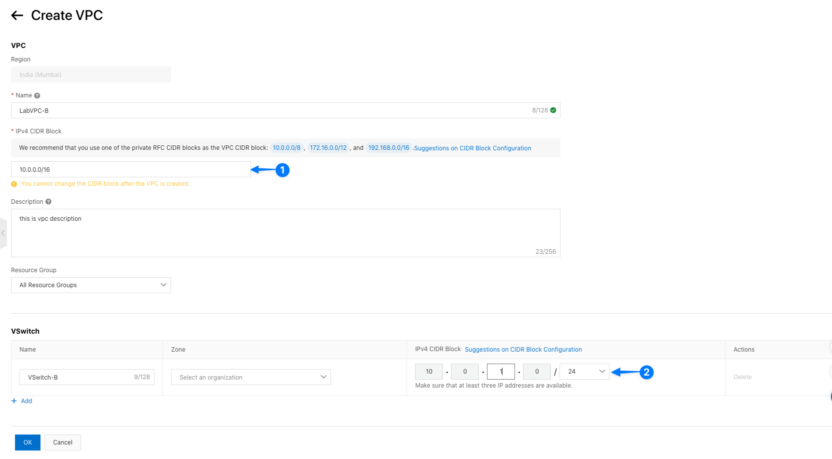 - VSwitch: Create a VSwitch within VPC B with a CIDR block (e.g., 10.0.1.0/24)