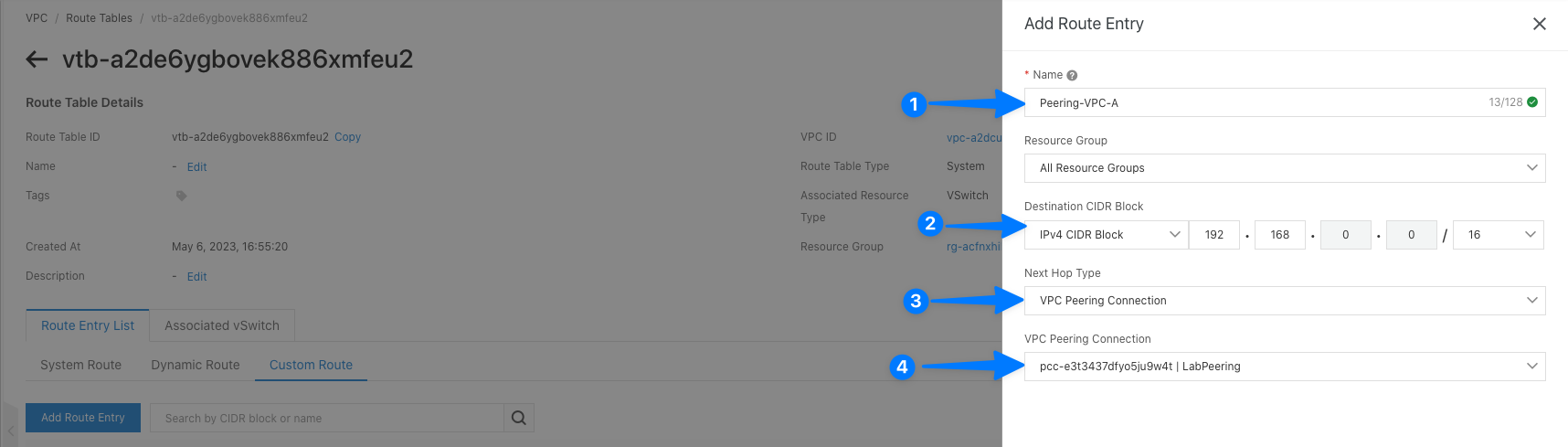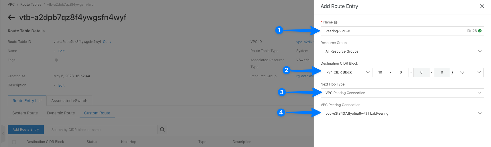- Destination CIDR Block: CIDR block of LabVPC-B (e.g., 10.0.0.0/16)